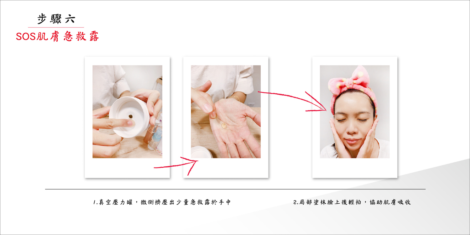 ‧  取適量均勻塗抹於臉部(包含眼眶))和頸部,輕輕按摩片刻直到肌膚吸收即可  ‧
